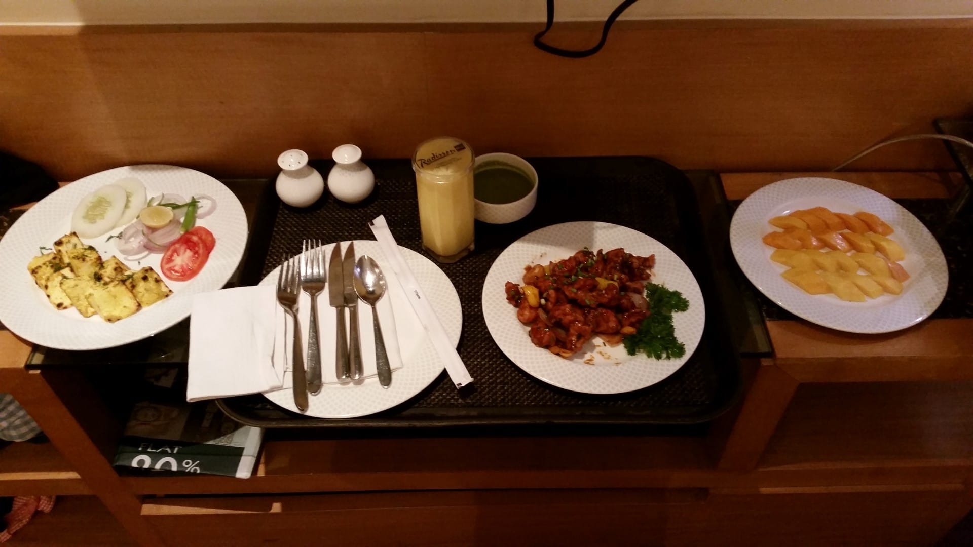 Müde vom Flug geht es ab ins Hotel und ich lasse mir yummy Essen auf’s Zimmer bringen. Der Service ist insgesamt in Indien genial.