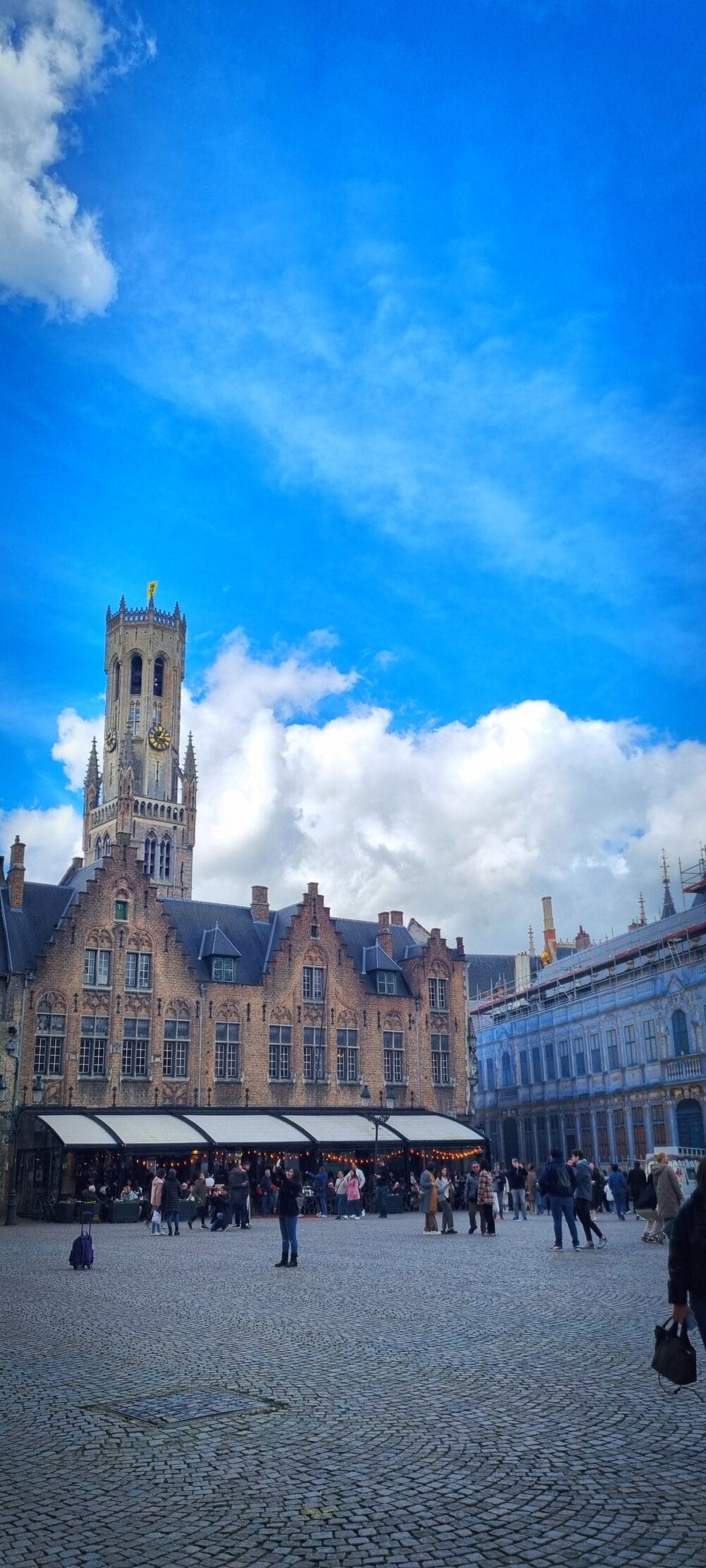 Nach dem Frittenmuseum laufen wir am Biermuseum vorbei, lassen dieses aber rechts liegen. Auch den Belfort, das Wahrzeichen von Brügge und einer der Hauptspielplätze im Film „In Bruges“ von 2008, schauen wir nur von aussen an. Dieser Turm ist 83 m hoch und diente im Mittelalter als Brandwache. Noch heute darf kein Gebäude diese Höhe überragen.